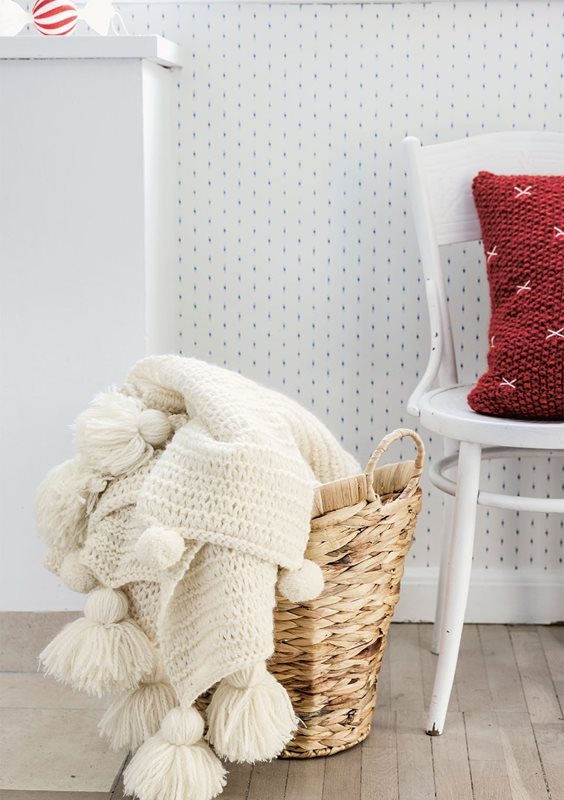 Teppe strikkes i mønster med lange masker. Det lages 9 pomponger som sys langs oppleggskanten og 7 store avlange dusker som sys til avfellingskanten.