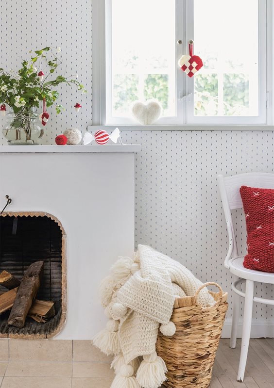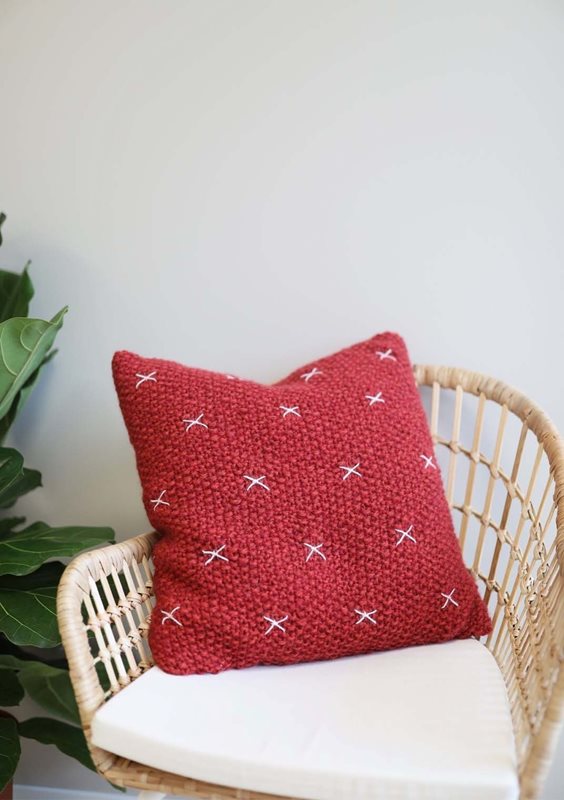 Puten strikkes rundt i perlestrikk og med glattstrikkede ruter. Det broderes korssting med MINI ALPAKKA i de glattstrikkede rutene. Til slutt sys bunnen sammen, fyllputen blir plassert i og toppen sys sammen.