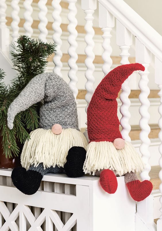 Begynn med å legge opp masker til luen og strikk den nedenfra og opp med fellinger midt bak.Strikk opp masker på innsiden av luen og strikk kroppen ovenfra og ned. Før kroppen strikkes ferdig lages det hull til ben. Bena strikkes ferdig for seg. Til slutt klippes det tråder til skjegg og det strikkes en nese. Skjegget og nesen festes til kroppen rett under luen.