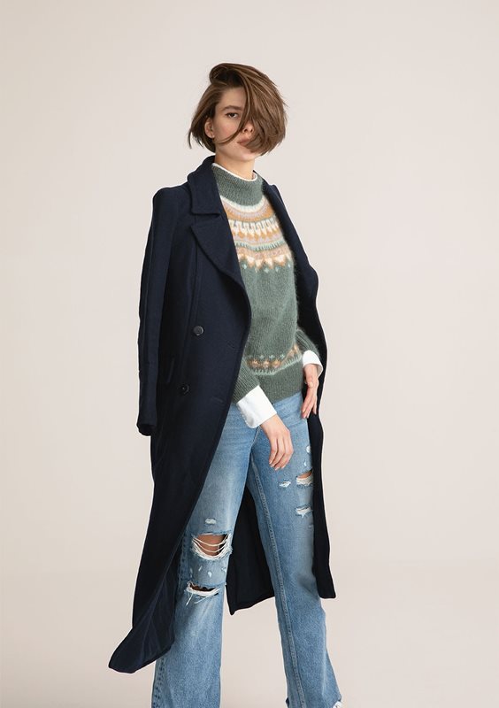 Ermer, for- og bakstykket strikkes nedenfra og opp. under ermene strikkes delene sammen. Det strikker mønster i glattstrikk etter diagram og felles til rundt bærestykke.For å forme en dypere halsutringning foran, strikkes det vendepinner med GSR. Halskanten strikkes til slutt.