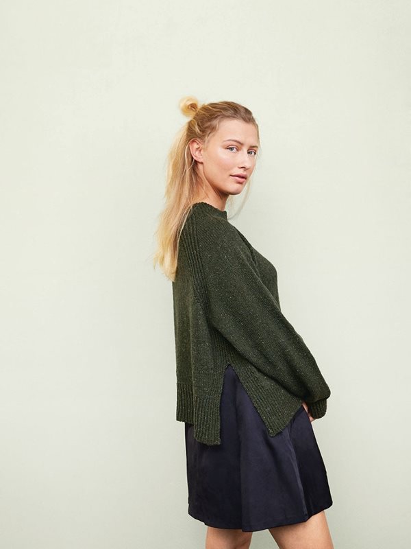 Genseren strikkes nedenfra og opp med raglanfellinger i Tweed Recycled.