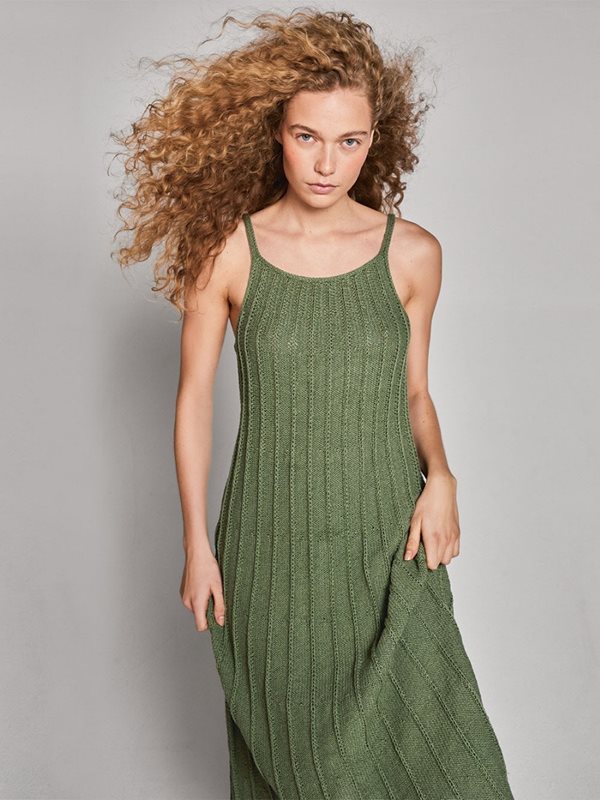 Klänningen stickas uppifrån och ner i Line.