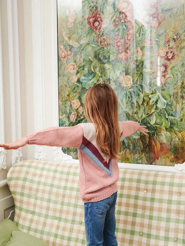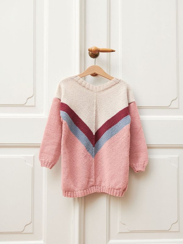Första delen av framstycket stickas fram och tillbaka i 2 delar och det ökas maskor i sidan till hel bredd. Därefter stickas de 2 delarna tillsammans, och det ökas i sidan och minskas mitt fram så att det formas en V-form. Bakstycket stickas på samma sätt. Ärmarna stickas runt och delarna sys ihop under montering.