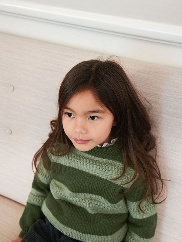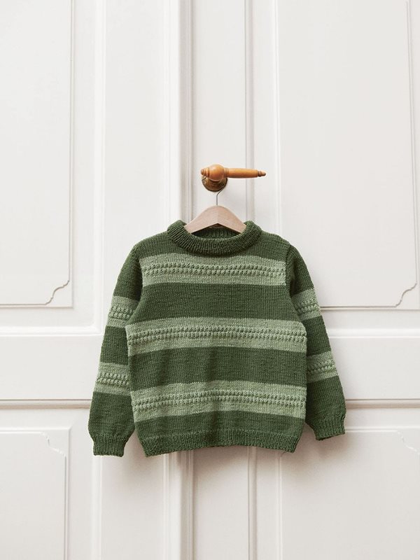 Tröjan stickas runt med randmönster, nerifrån och upp till under ärmarna. Arbetet delas i sidorna för ärmhål och härifrån stickas fram- och bakstycke färdiga var för sig. Ärmarna stickas runt uppifrån och ner. Först stickas det vändvarv för att forma en fin ärmkulle, vidare stickas det randmönster som på fram- och bakstycket.Halskanten stickas till slut.