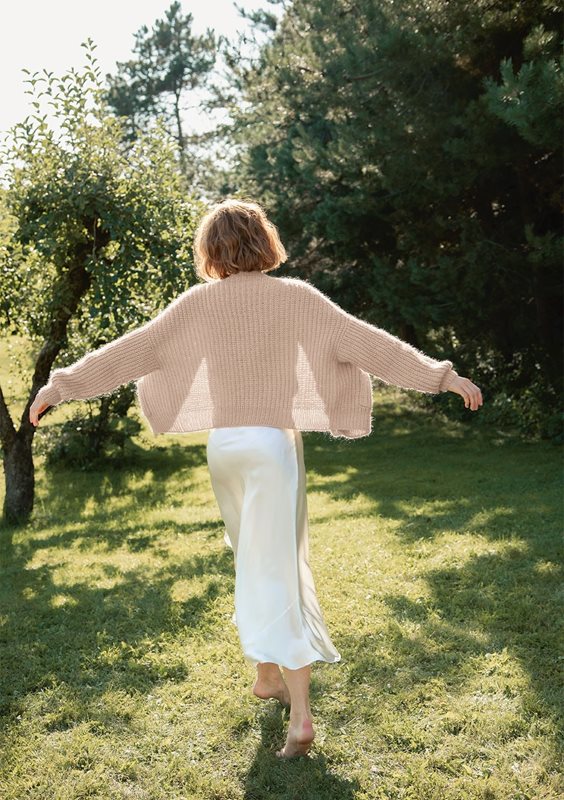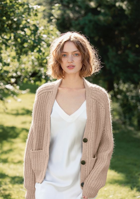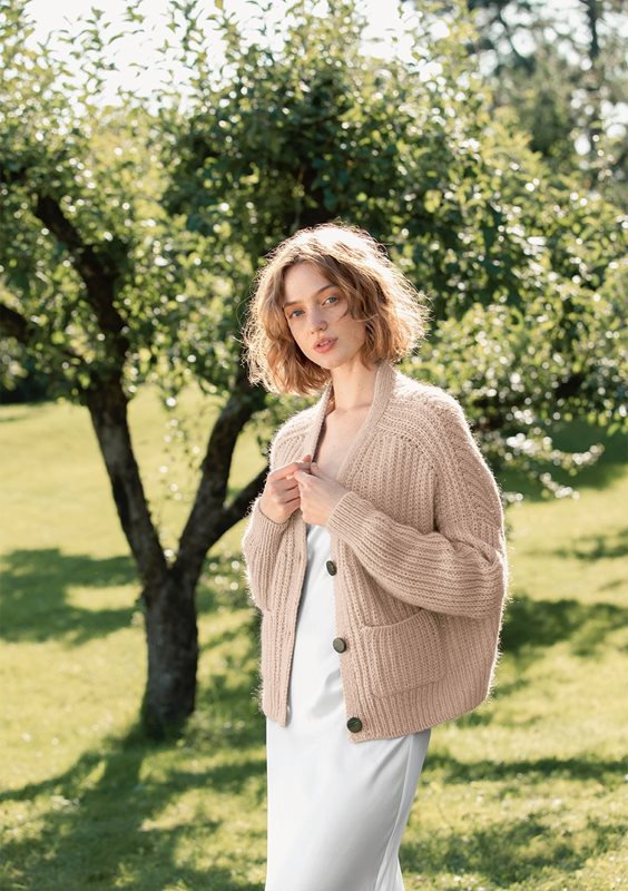 Koftan stickas uppifrån och ner i halvpatent, i Double Sunday och Tynn Silk Mohair.