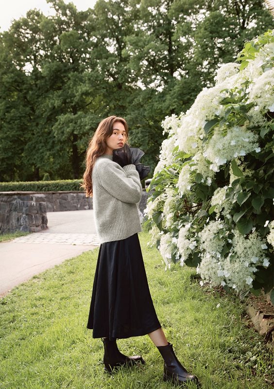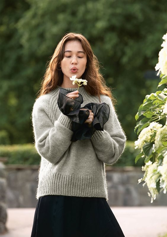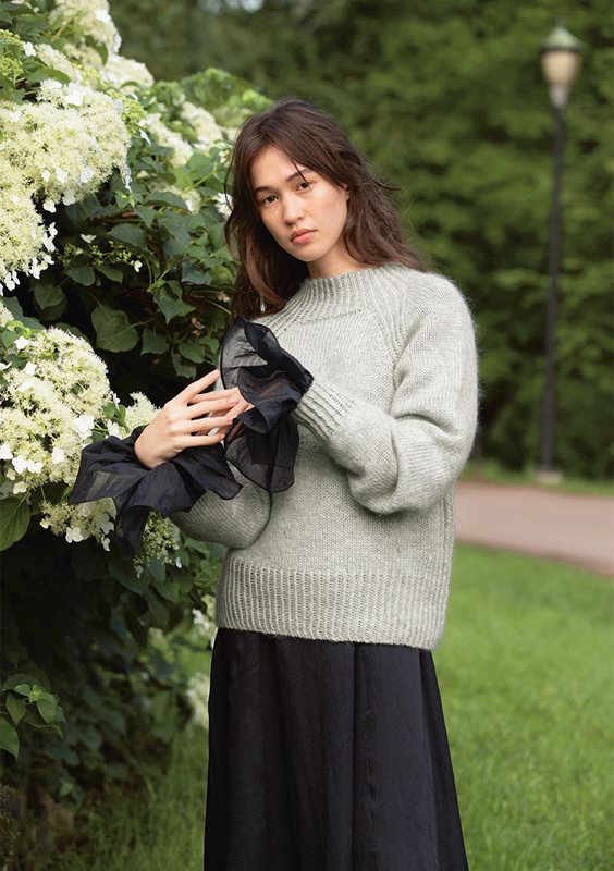 Tröjan stickas uppifrån och ner i 1 tråd Peer Gynt och 1 tråd Tynn Silk Mohair, med ökningar till raglan. Arbetet delas till ärmar, fram- och bakstycke. Vidare stickas fram- och bakstycke runt med resår i sidorna. Ärmarna stickas till slut.