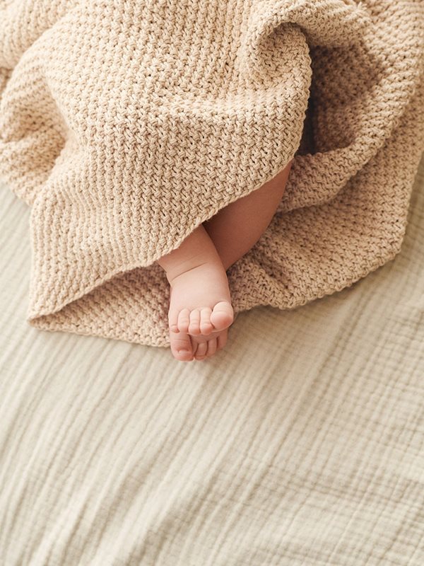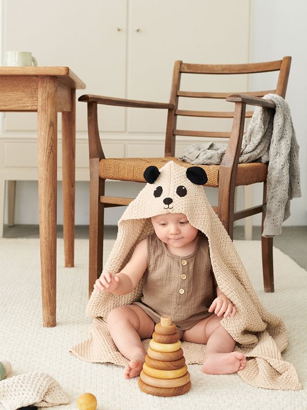 Handduk med huva och ansikte i dubbel mosstickning, stickad och virkad i Mandarin Petit.