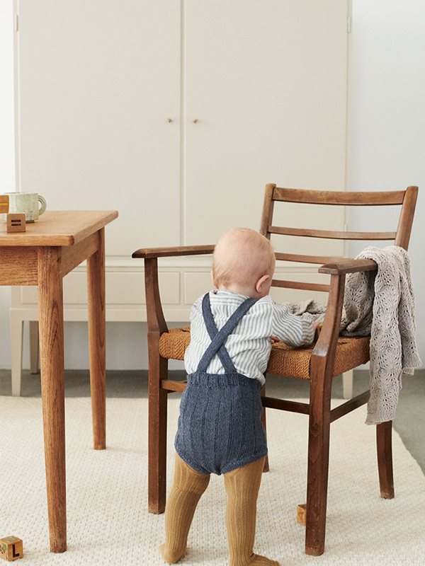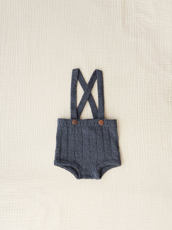 Kortbyxa med brett ribbmönster och hängslen. Byxan stickas uppifrån och ner i Tynn Line med German short rows för att göra den rymligare bak.