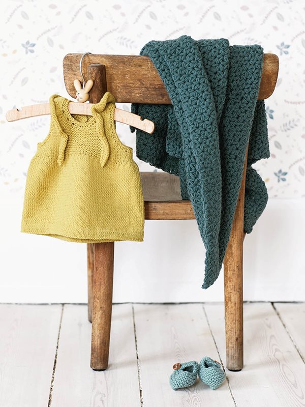 Kjole med rysjer og rillestrikk, strikket i Tynn Merionull