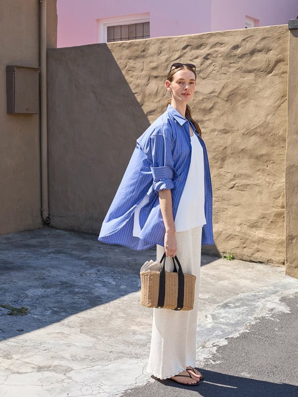 Byxan stickas uppifrån och ner i slätstickning med 2 trådar TYNN LINE. Välj gärna 2 olika färger i TYNN LINE för en melering. Det stickas först en dubbel linning till att trå en resår genom. Vidare stickas det vändvarv för att göra byxan högre bak. Det ökas masker mitt fram och mitt bak till kil före arbetet delas, och vart ben stickas färdiga var för sig. Under montering virkas det en uddkant runt avmaskningskanten nere på benen.