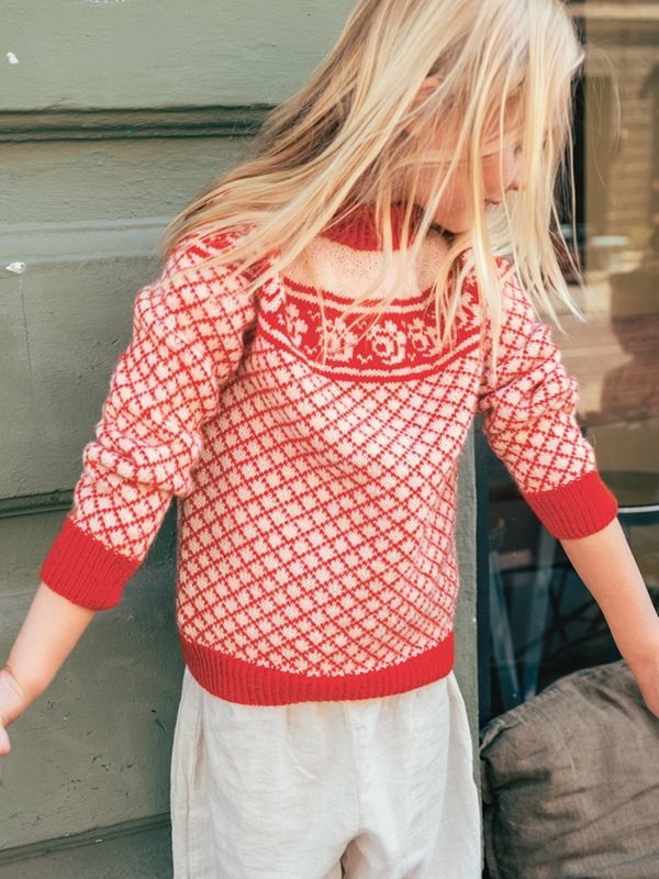 Blome genser junior er en skatt fra arkivet, strikket i Tynn Peer Gynt. En klassisk rundfelt genser med rutemønster i 2 farger – tidløs strikk til små eventyrere.