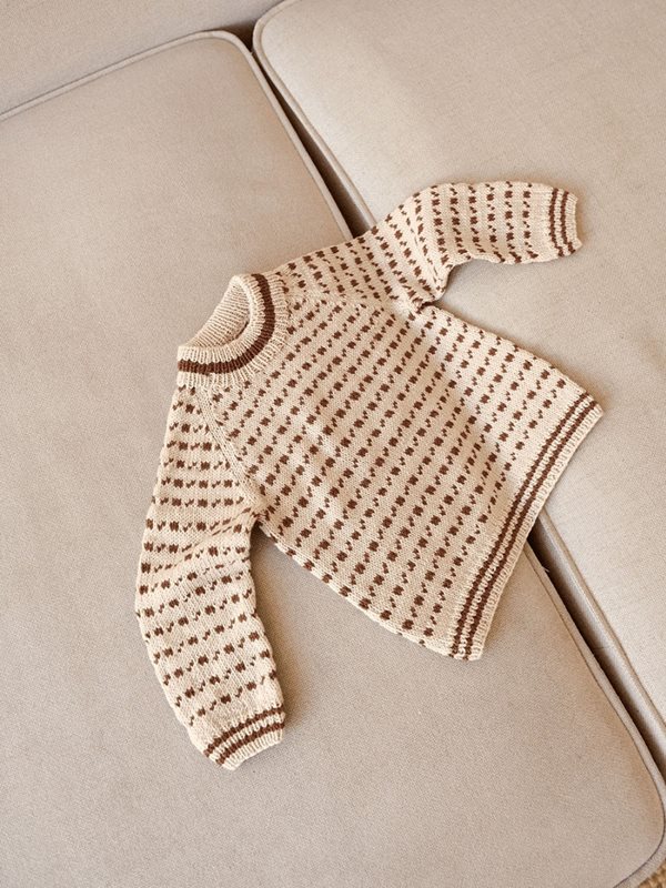 Islender genser baby i Tynn Merinoull er en liten favoritt med tradisjonelt mønster og lun struktur. Den strikkes nedenfra og opp med raglanfelling og dobbel halskant som gir en myk og behagelig avslutning.